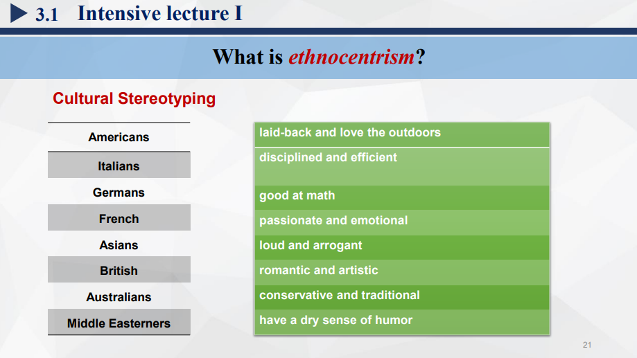 知识目标:帮助学生深入理解和牢固掌握ethnocentrism、stereotype、prejudice、discrimination、intercultural communication competence、intercultural communication awareness等概念的内涵和外延,以及跨文化交际障碍形成的原因。