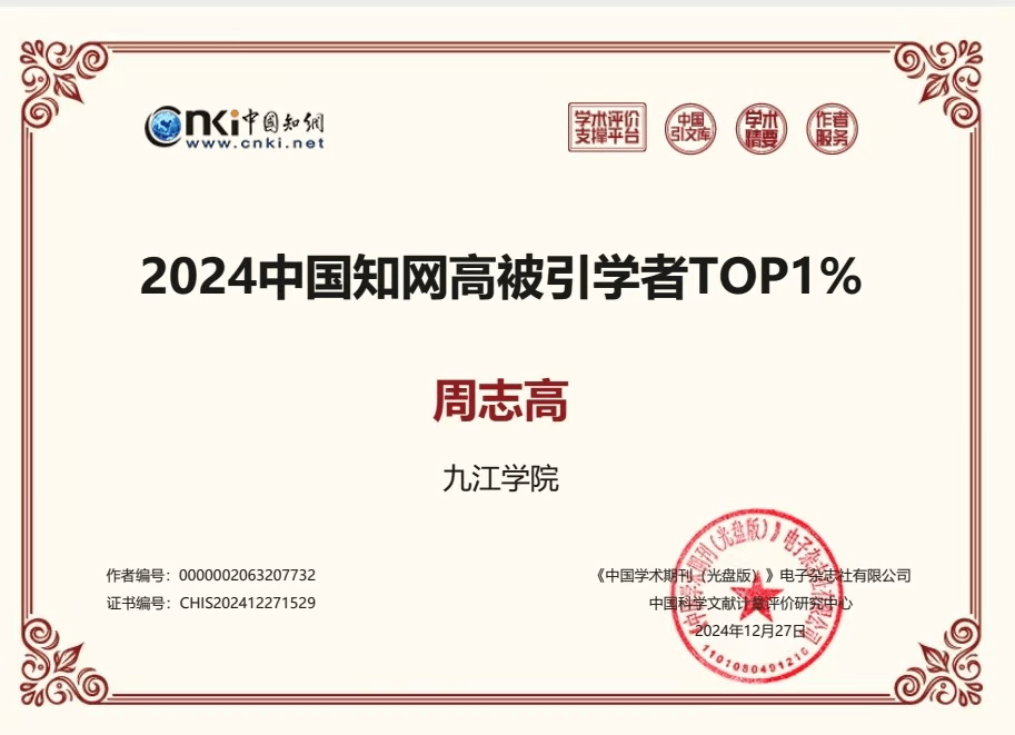 近日,中国知网的中国科学文献计量评价研究中心公布了“2024中国知网高被引学者”预发布名单,星空体育官网院长周志高教授入选“2024中国知网高被引学者TOP1%”。