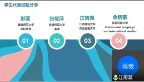 成功上岸安徽师范大学学科英语硕士的张妮萍,江西师范大学英语语言文学硕士的江雨薇,跨专业考上赣南师范大学学科地理硕士的彭莹,以及即将赴英国利兹大学深造的余恬蕙4位优秀学子以自己的亲身经历向学弟学妹们分享如何择校、择专业,分析所考专业考试的特点和学习技巧。