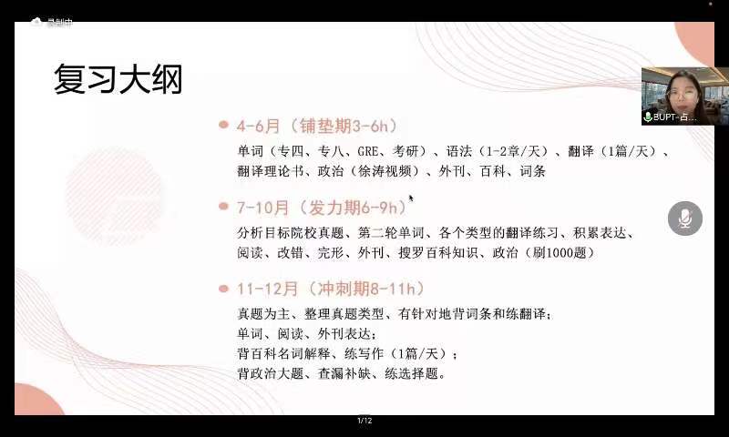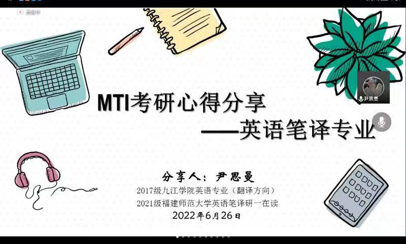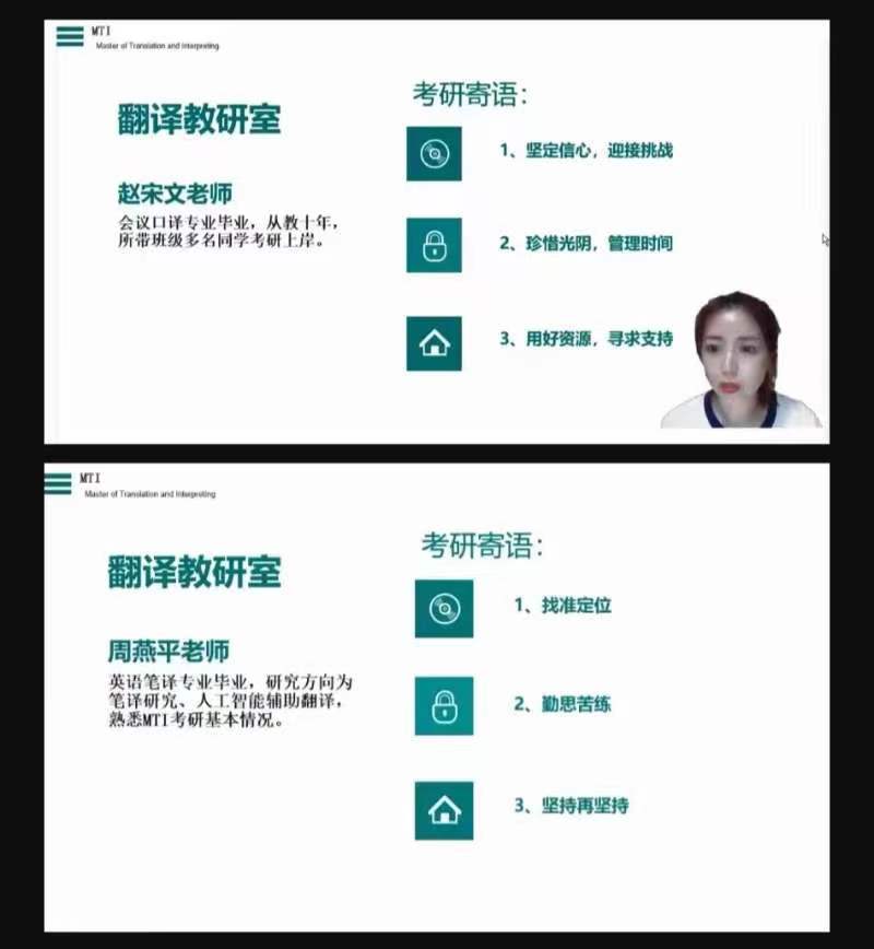 暑期将至,考研备考正当时。星空体育官方网站一直高度重视考研工作,通过多种举措鼓励广大学生积极参加考研。在学院领导的支持和关心下,近年来学院考研率节节攀升,屡创佳绩。为进一步帮助学生明确考研目标,掌握考研技巧,解答相关考研困惑,星空体育官方网站翻译教研室于6月26日线上举办翻译专业MTI考研经验交流会。本次会议由翻译教研室主任赵宋文主持,翻译教研室教师周燕平发言,7位成功考取翻译硕士MTI的同学主讲。学院各级各专业近百名学生参会。