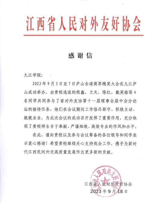 2023年9月5日至7日庐山全球商界精英大会在九江庐山成功举办,星空体育官网派外语专业学生志愿者积极参加活动并做好会议服务工作。