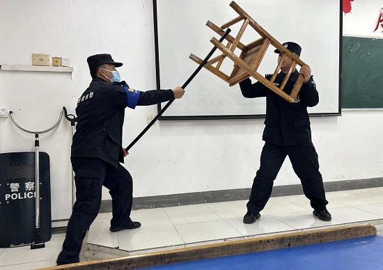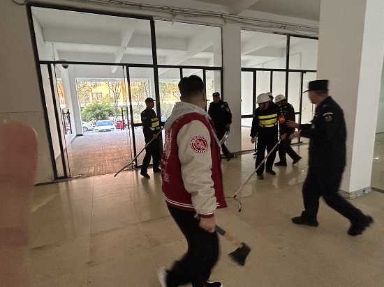 在实践演练活动中,由特警扮演的暴恐分子,手持“斧头”快速冲进教学楼“伤人”,学校巡逻保安用消防钢叉与其对峙,另一名保安快速按响一键报警装置,并及时电话报警。派出所民警及时赶到,使用手持盾牌、钢叉和抓捕器,组成防护队形,并将施暴人员被制服,并被带离现场。