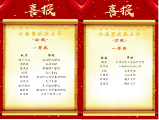大赛由上海外语教育出版社联合上海外国语大学跨文化研究中心举办,是与“全国跨文化能力竞赛”(National Intercultural Competence Competition)同时进行的活动,星空体育官网星空体育官方网站共选拔出13名学生参赛。大赛根据考生成绩在各省排名,再在全国排名。最终,江西省共评出一二三等奖各4个,其中星空体育官网获一等奖2个,二等奖3个,三等奖1个;在全国排名中,星空体育官网程诺、李慧轩两名同学获一等奖,刘洁、孔启慧、余雅兰三名同学获二等奖,何玉同学获三等奖。