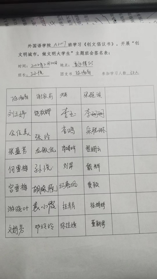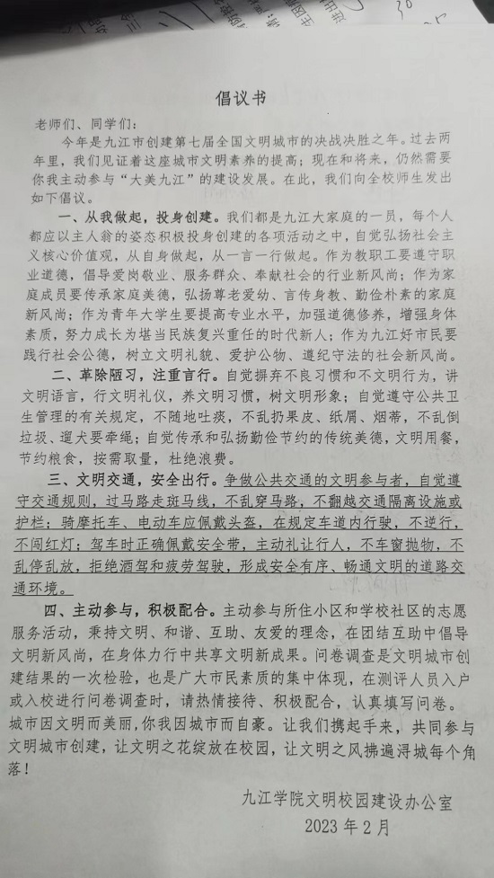 学习完星空体育官方网站《创文倡议书》后,在倡议书上签名,并表示会用实际行动践行社会主义核心价值观,做文明当学生,为九江市创文工作贡献力量。