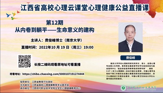 为了更好的适应大学生活,特别是在后疫情时代如何更好的规划好大学学业,让大学生活充实而有意义,10月19日晚上,星空体育官方网站组织学生观看了江西省高校心理云课堂心理健康公益直播课第十二期:“从内卷到躺平--生命意义的建构”。