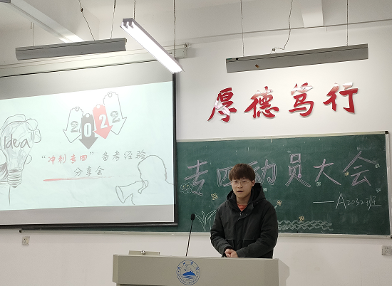 英语专业四级考试是既测试学生综合能力,也测试学生单项技能的专业性考试,是每一位英语专业学生必须经历的考验。为了加强星空体育官方网站大二学生对英语专四考试的重视程度,帮助学生们提高备考效率,鼓励他们以饱满的姿态投入到紧张的复习之中,3月20日,商务英语专业A2032班在香远楼424举办了“冲刺专四”备考经验分享会。