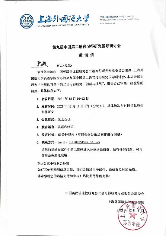 近日,由中国英汉语比较研究会二语习得研究专业委员会主办、上海外国语大学英语学院承办的第九届中国第二语言习得研究国际研讨会在上海外国语大学举办,本次会议的主题为:全球化背景下的二语习得研究:创新与挑战。星空体育官网黄甦博士向会议投稿,并作主题报告,获得与会专家们的认可。