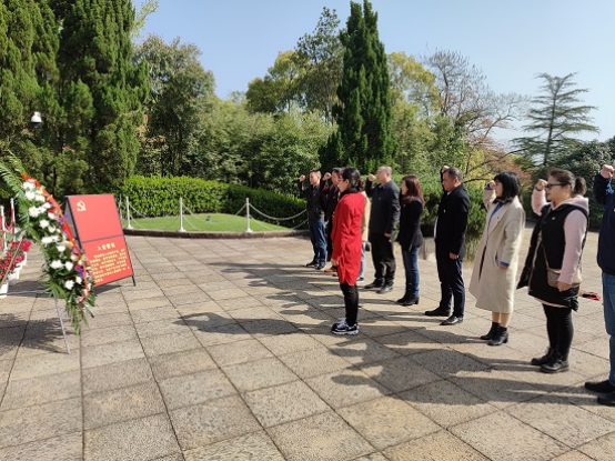 座落于共青城富华山的耀邦陵园松柏环抱、绿荫满园、安静庄严。全体党员怀着无比崇敬的心情瞻仰了耀邦墓,向耀邦同志敬献花篮,三鞠躬,表达了对这位伟大的无产阶级革命家、政治家的深切怀念和崇高敬意。