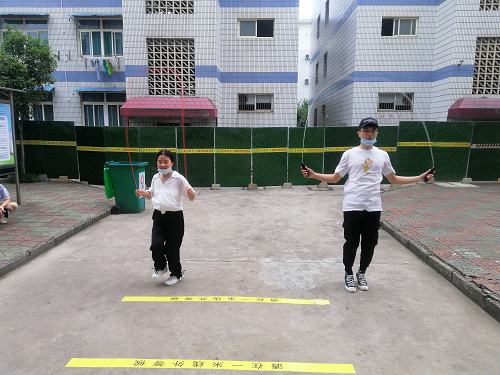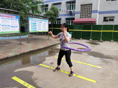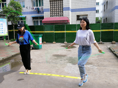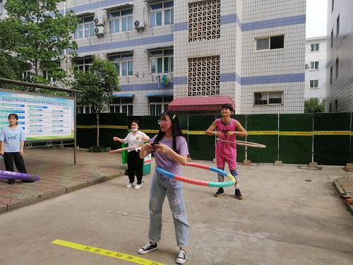 比赛项目按跳绳、踢毽子、转呼啦圈特定的顺序依次进行,其中评分规则:跳绳计跳30秒的个数;踢毽子取三次机会最多次的个数;呼啦圈比转呼啦圈时长。比赛分教工组和学生组两个组别,都以单人项进行比赛,为控制人员密度,每位参赛者需按照随来随比、赛后离场的“流水式”赛规进行。微运会开始,教工组率先进行单人项目的比拼,只见辅导员们肢体灵活,动作敏捷,跳绳、踢毽子、转呼啦圈样样不在话下,赢得观众的阵阵欢呼。