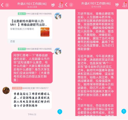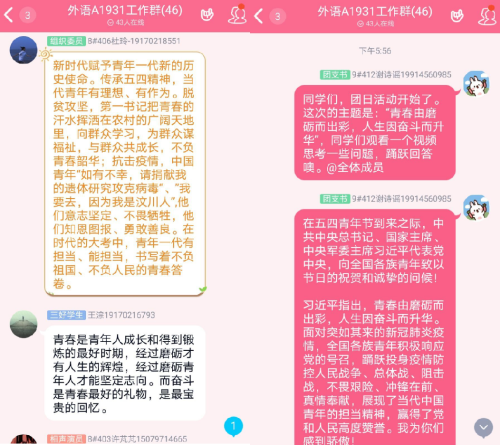 吾辈中国,青年奋起。为纪念“五四运动”101周年,贯彻落实习近平总书记寄语新时代青年的讲话精神,让广大团员切身认识到五四精神的重要性,让中国精神焕发光彩、薪火相传,5月7日星空体育官方网站大一年级各班运用微信、腾讯QQ等平台,以在线共同观看视频、讨论相关图片等形式开展了以“青春由磨砺而出彩,人生因奋斗而升华”为主题的线上团日活动。