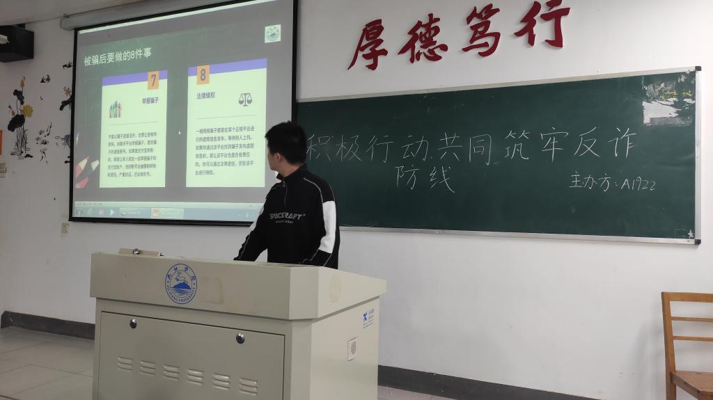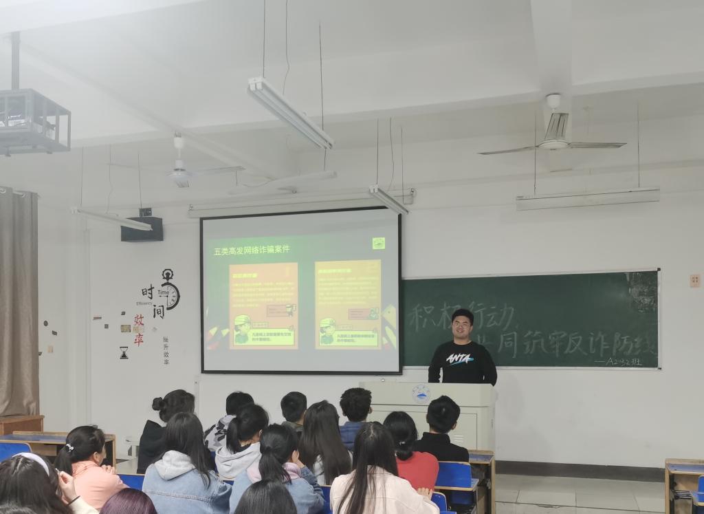 各班班长首先向同学们详细介绍了电信诈骗主要方式,如何设置骗局,使受害人打款或转账的犯罪行为。随后,各班班长更加深入地分析了电信诈骗的危害,及大学生容易受到电信诈骗的原因。为了能让大家有更深入地了解,主讲人列举出电信诈骗的几种常见手段,并通过实例的展示使其更加浅显易懂。同时,各班班长分点列出了大学生防范电信诈骗的具体方式,以及遇到电信诈骗的应对举措。
