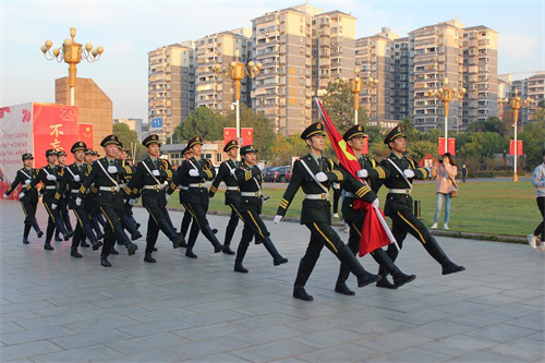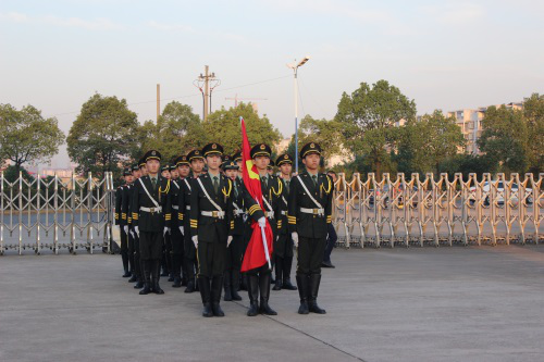 在B1941班郭欣同学的主持下,升旗仪式正式开始。国旗班的同学们风姿绰约,迈着铿锵有力的步伐走向庄严的升旗台。